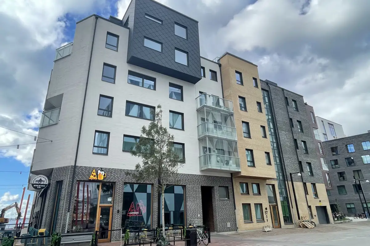 Första fasaden på bostadsdelen är klar på Kvarteret Triton.