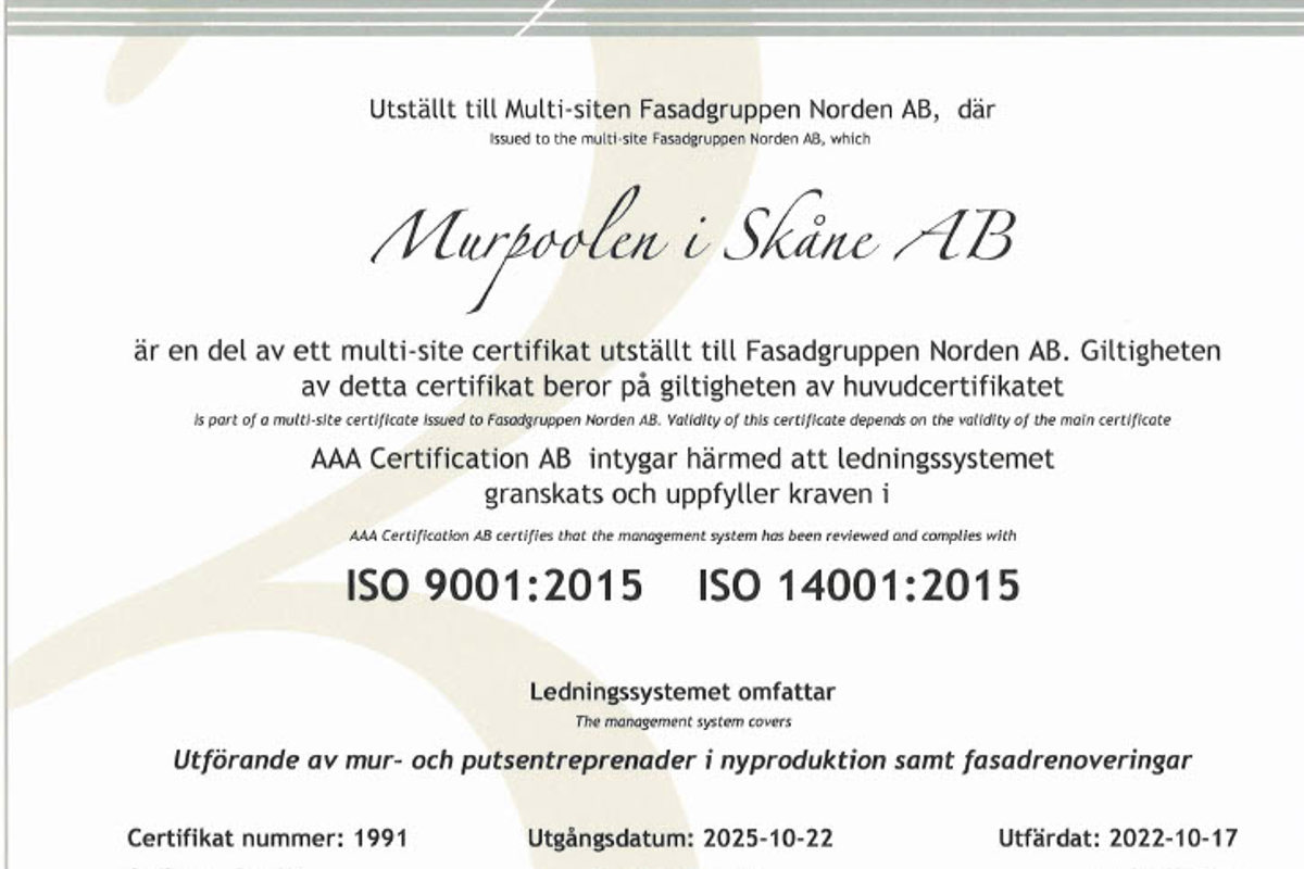 Under hösten 2019 certifierades Murpoolen och erhöll certifikat för ISO 9001 och 14001.